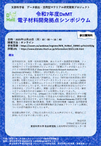 D2MatEでは令和7年度DxMT電子材料開発拠点シンポジウムを以下のように開催いたします。 開催日時:2025年12月15日(月)10:00 ~ 16:40 開催方法:オンライン 参加費:無料 参加登録:こちらの登録フォームからご登録下さい。
