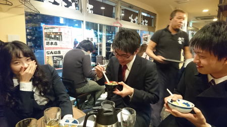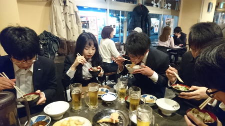発表終了後、みんなで大阪の天ぷらやに行きました。人気店のため1時間並びましたが、その分美味しかったです。小笠原君は、貝殻を捨てる行為(この店のルール)にはまって、アサリの味噌汁をおかわりしてまで貝殻を捨てまくっています。