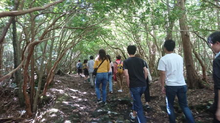 忍野八海できれいな景色や魚に癒やされる学生達。