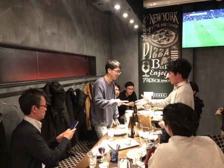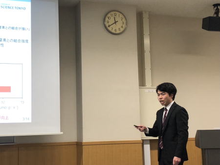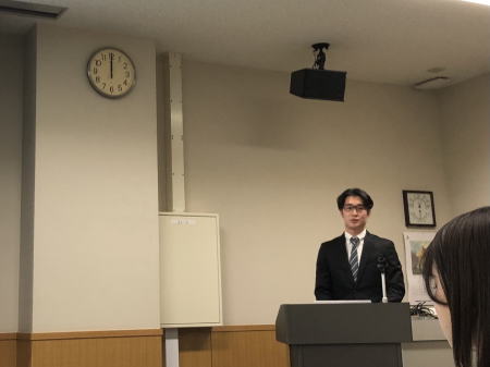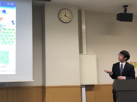2月6日に、M2の3名が修論発表を行いました。。 順に、川村君、森君、仁井田君が発表しました。皆さん緊張してましたが、修士研究の集大成を立派に発表していました。 翌日、修論お疲れ様会を開きました。後輩達からお祝いの品をもらっています。本当にお疲れ様でした。仁井田君は、これから博士進学ですがこれからの活躍期待しています!