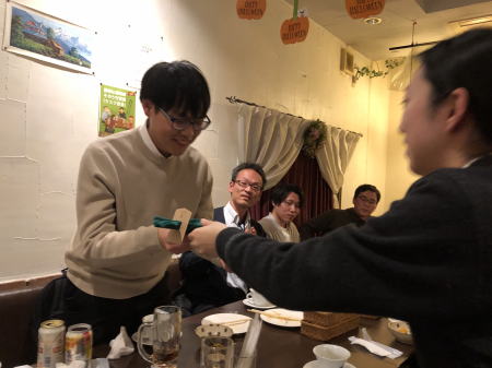10月から約5ヶ月間YSEP制度を使って台湾国立大学から留学に来ていたChun-Lin Yeh さんの送別会を行いました。 5ヶ月はあっという間でしたが、研究室の学生達ともよく打ち解けて、研究も頑張ってくれました。お疲れ様でした!。